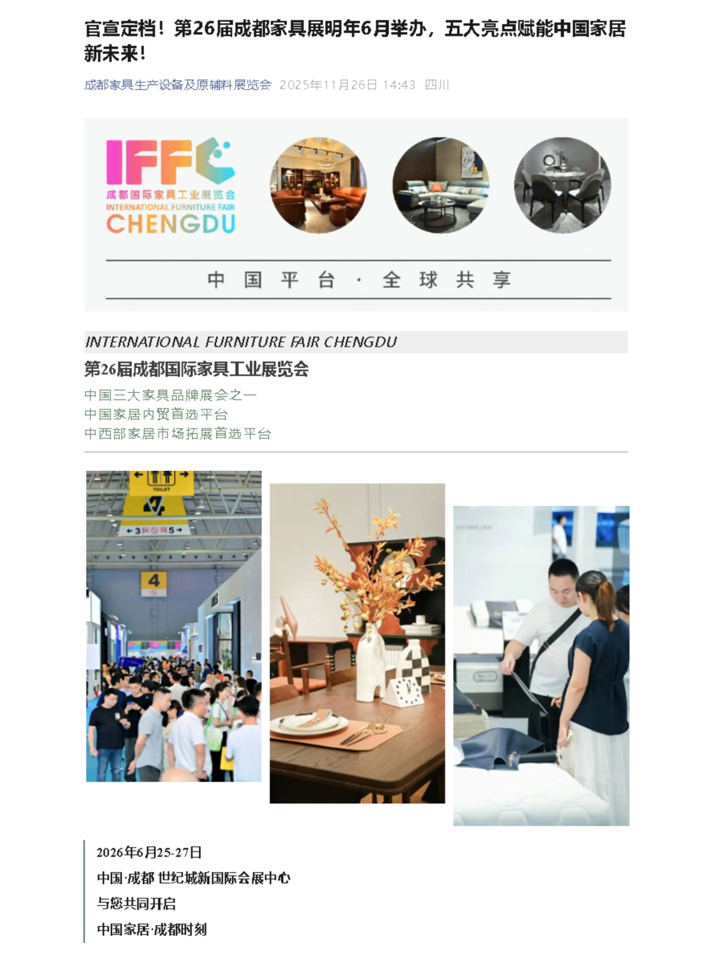 官宣定档!第26届成都国际家具工业展览会将于2026年6月25-27日在成都新会展中心举办!